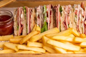 toasted bread, mayonnaise, Gouda, lettuce, tomato, ham, bacon, and French fries (Φρυγανισμένο ψωμί του τοστ, μαγιονέζα, Gouda, φρέσκο μαρούλι, φρεσκοκομμένη ροδέλα τομάτας, ζαμπόν, μπέικον και συνοδεύεται από τηγανιτές πατάτες)Classic Club Sandwich 6,50€