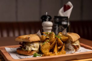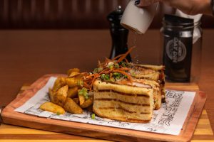 grilled bread with fresh butter, smoked pulled pork, mustard sauce, pickled cucumber, ham, melted cheese and country potatoes (σχαριασμένο ψωμί με φρέσκο βούτυρο, μαδημένος καπνιστός χοιρινός λαιμός, σάλτσα μουστάρδας, αγγουράκι τουρσί, ζαμπόν, λιωμένο τυρί και country πατάτες)Cuban Sandwich 7,00€