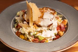 crispy iceberg, Caesar sauce, chicken, corn, cherry tomatoes, crouton, parmesan cheese and bacon (τραγανό iceberg, σάλτσα Caesar, κοτόπουλο, καλαμπόκι, τοματίνια, κρουτόν, παρμεζάνα και μπέικον)Our Caesar's salad 6€