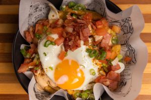 with smoked bacon, Cipriani sauce and fried egg (Country πατάτες τηγανιτές με καπνιστό μπέικον, σάλτσα Cipriani και τηγανιτό αυγό)Cipriani potatoes 5,50€
