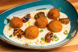 with truffle crème and mushrooms (τραγανά Arancini με κρέμα τρούφας και μανιτάρια)Crispy Arancini 6,50€