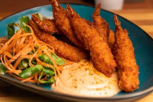 with sweet chilli mayonnaise (τηγανιτές γαρίδες με γλυκοκαυτερή μαγιονέζα)Deep fried prawns 7,00€