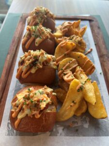 4mini brioche buns with sausages, mustard sauce, sour croute, cheddar cheese, chipotle sauce, and crispy onions. (4 mini ψωμάκια μπριός με λουκανικα, σάλτσα μουστάρδας, ξινό λάχανο, τυρί cheddar, σάλτσα chipotle και τραγανά κρεμμύδια)Mini American Hot Dogs 6.00€