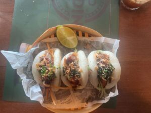 with fried pulled pork, sesame, cucumber, spring onion & Asian BBQ sauce (μαδημένο χοιρινό σε αφράτα Bao bun ψωμάκια με σουσάμι, αγγούρι, κρεμμυδάκι φρέσκο και Ασιάτικη ΒΒQ)Asian BBQ Pulled pork Bao 6,50€
