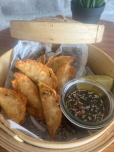 Fried chicken gyoza with sesame & soya sauce. (τηγανητή Gyoza κοτόπουλο με σάλτσα σόγιας αρωματισμένη με σησαμέλαιο, μοσχολέμονο και τσίλι)Chicken Gyoza 8.00€